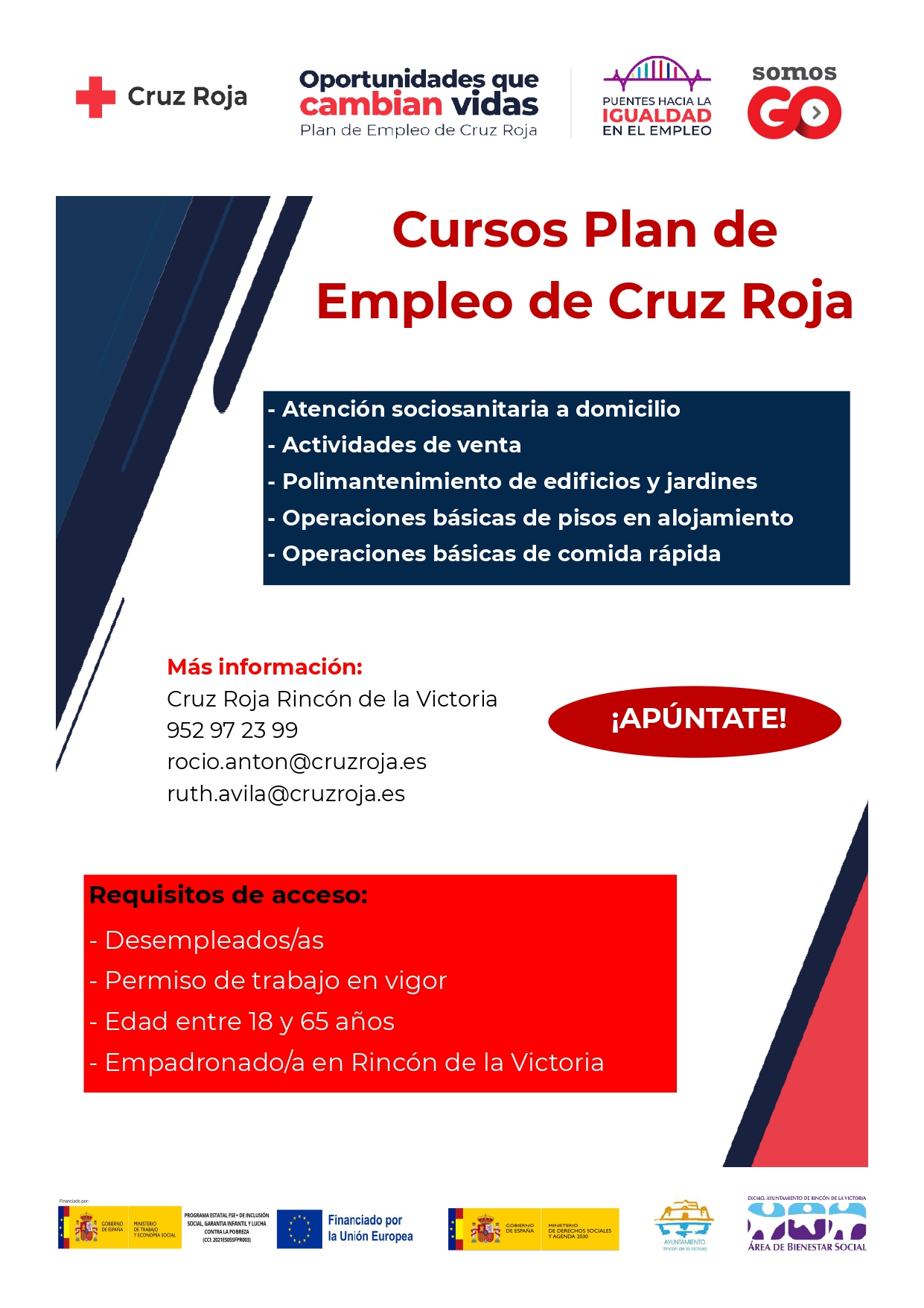El Área de Bienestar Social del Ayuntamiento de Rincón de la Victoria junto a la Asamblea Local de Cruz Roja han anunciado la apertura del plazo de solicitudes para cinco acciones formativas dirigidas a personas desempleadas y empadronadas en el municipio.