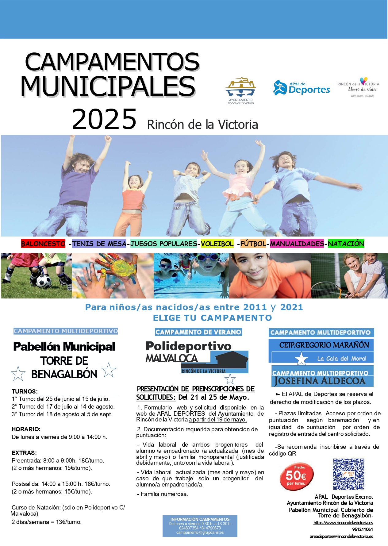 La programación está dirigida a niños y niñas de 4 a 14 años (nacidos entre 2011 y 2021) e incluye actividades como baloncesto, fútbol, tenis de mesa, juegos populares, manualidades, entre otras. Este año también se ofrecerán servicios opcionales de aula matinal (de 8:00 a 9:00 h) y post-salida (de 14:00 a 15:00 h).