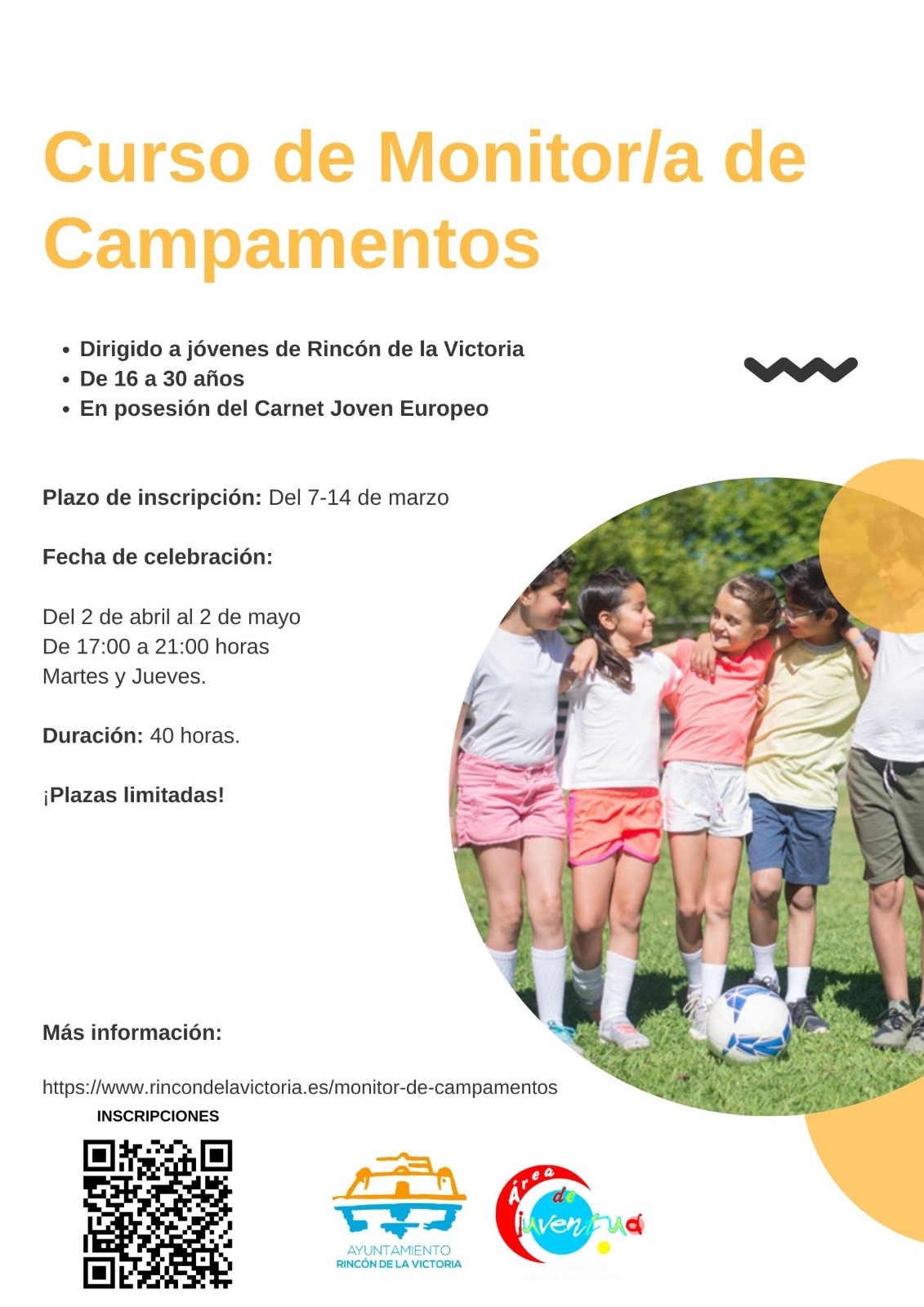 Las inscripciones se abren este jueves 7 de marzo, y se realizarán cumplimentando un formulario online que se encuentra en la siguiente dirección web: https://www.rincondelavictoria.es/monitor-de-campamentos