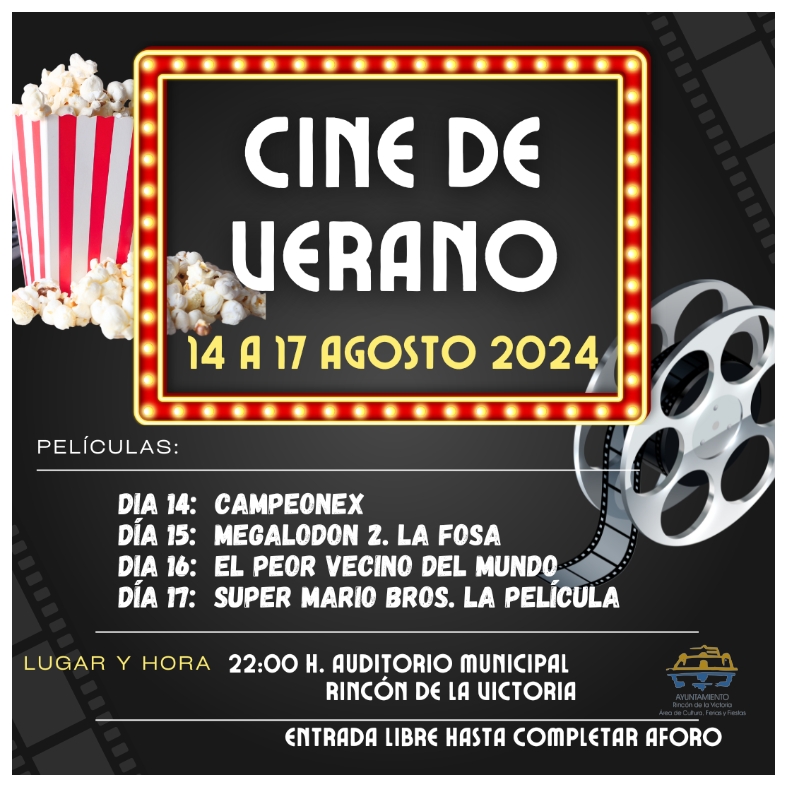 La concejala de Cultura, Mari Paz Couto , ha explicado que “instalaremos una gran pantalla para convertir nuestro auditorio en un cine de verano para disfrutar de los siguientes títulos cinematográficos: Campeonex (14 de agosto), Megalodón 2. La fosa (15 de agosto), El peor vecino del mundo (16 de agosto), y Súper Mario Bros. La película (17 de agosto).