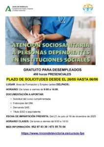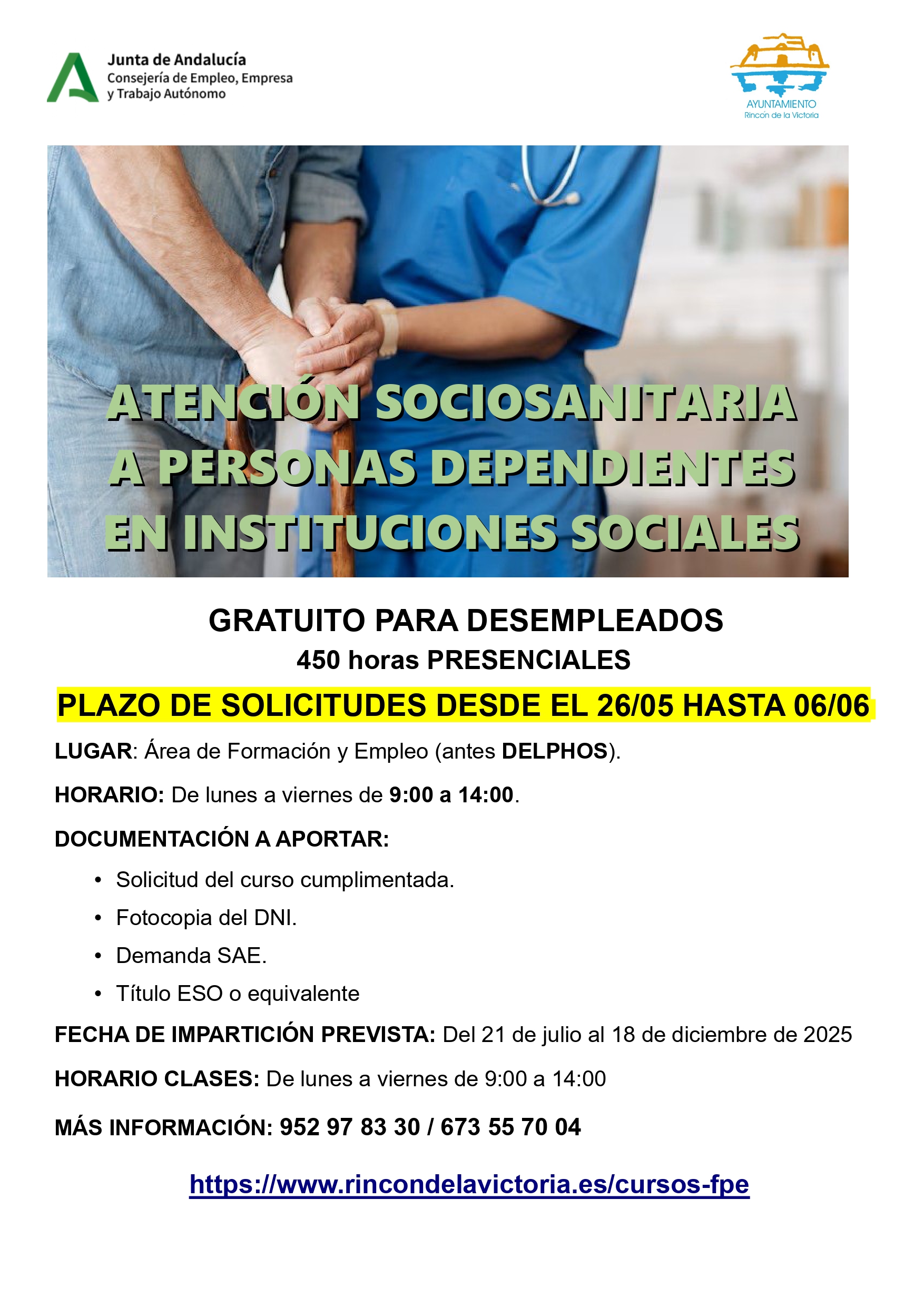 El Ayuntamiento de Rincón de la Victoria, a través del Área de Formación y Empleo, ha abierto el plazo de solicitudes para participar en dos nuevas acciones formativas gratuitas dirigidas a personas desempleadas, enmarcadas dentro del programa de Formación Profesional para el Empleo (FPE) financiado por la Consejería de Empleo, Empresa y Trabajo Autónomo de la Junta de Andalucía.
