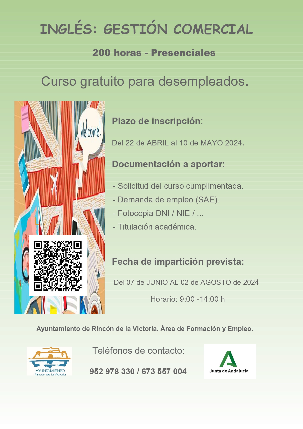 El Ayuntamiento de Rincón de la Victoria, a través de su área de Formación y Empleo, abre hoy el plazo de solicitudes de un nuevo curso formativo de Inglés Gestión Comercial destinado a personas desempleadas.