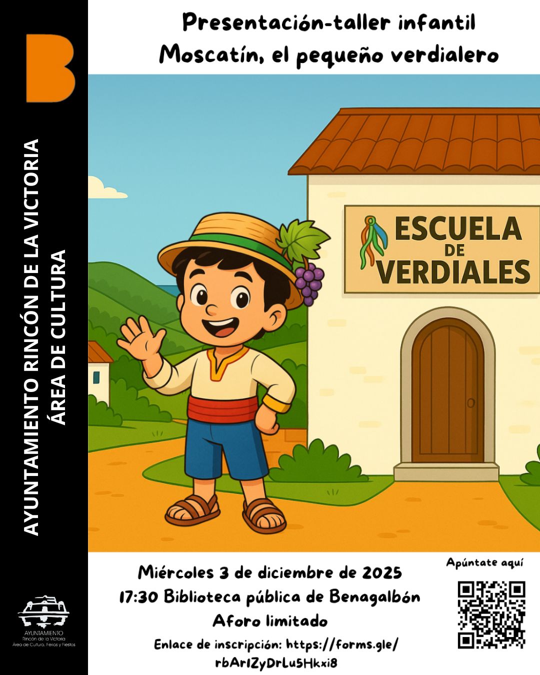 La actividad permitirá que los niños y niñas se sumerjan en la historia de Moscatín, un personaje ligado a Benagalbón y a la tradición de los verdiales, mediante una propuesta didáctica y divertida, tal y como explica la concejala de Cultura, Feria y Fiestas, Paz Couto, quien ha destacado que “se trata de una oportunidad para que los más pequeños descubran la riqueza cultural de nuestro municipio”.