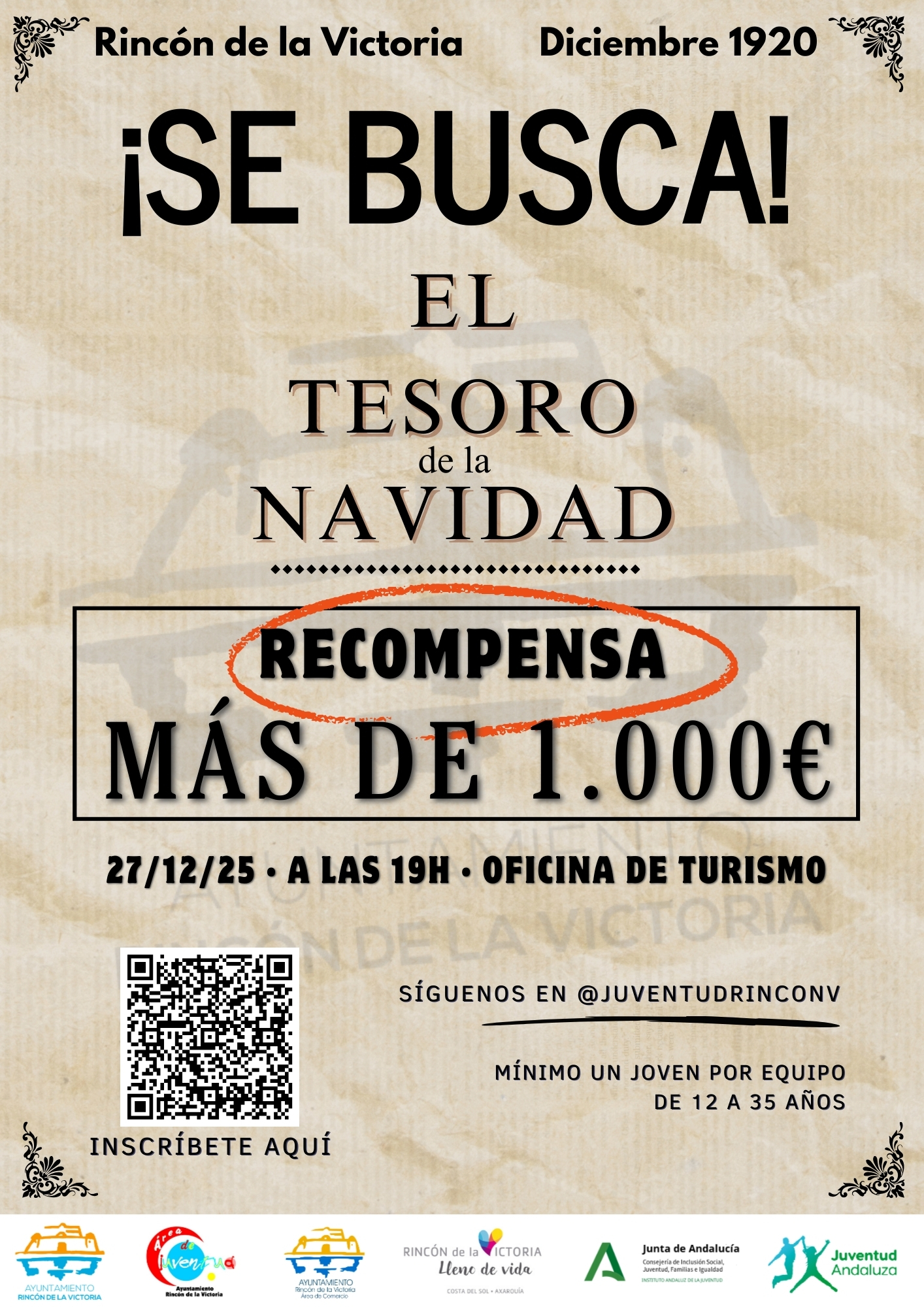 Las inscripciones podrán realizarse online, desde hoy, lunes 22 de diciembre y hasta el inicio de la actividad, a través del QR del cartel, en la web municipal: https://www.rincondelavictoria.es/areas/juventud/eventos-para-jovenes/actividades-en-navidad, o mediante la biografía de Instagram del Área de Juventud @juventudrinconv.