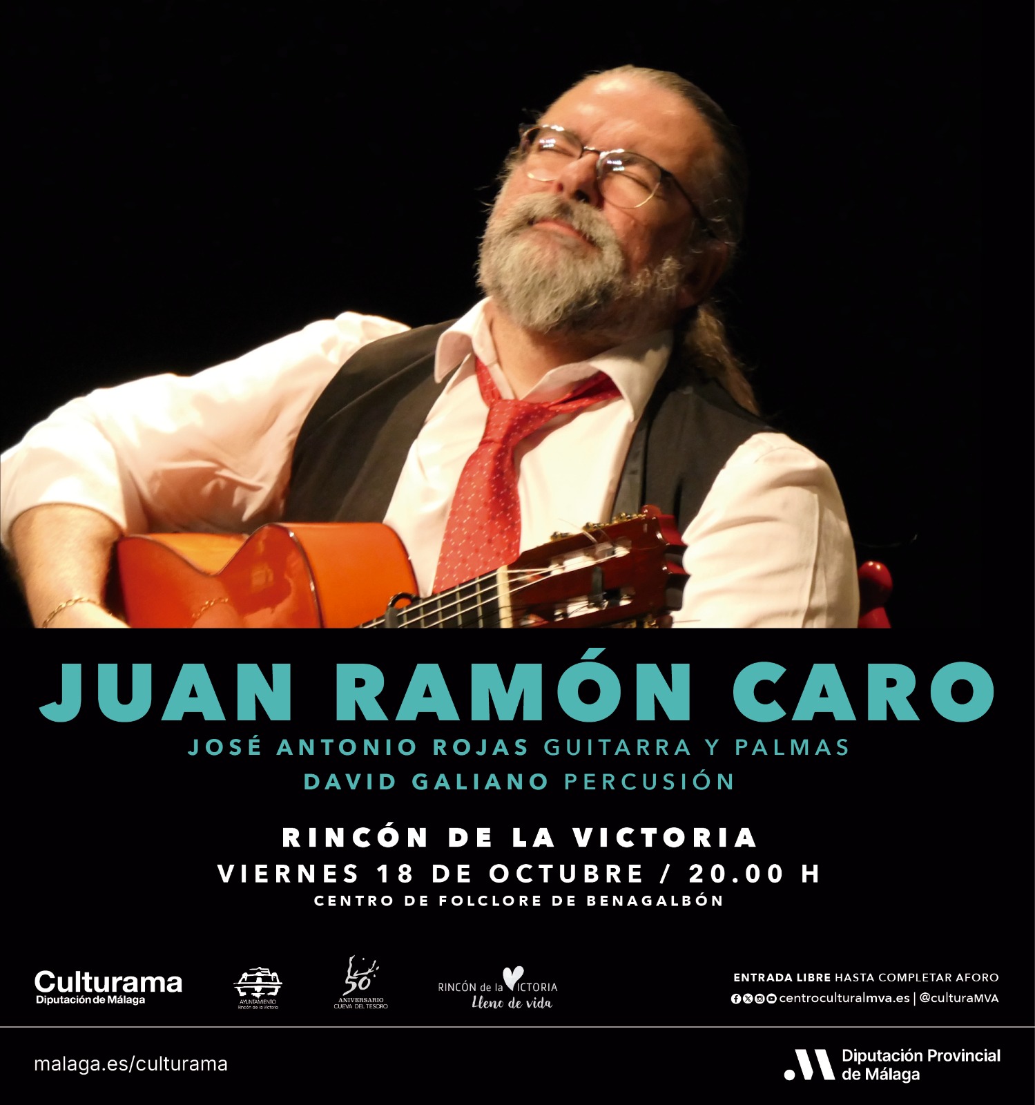 En esta ocasión, será el Centro del Folclore de Benagalbón el lugar de celebración de este concierto donde Juan Ramón Caro, que estará acompañado por José Antonio Rojas, a la guitarra y palmas, y David Galiano en la percusión, ofrecerá un recital de guitarra de concierto, en el que podremos escuchar sus composiciones por soleá, guajira, bulerías, tangos, alegrías, rumbas, etc.