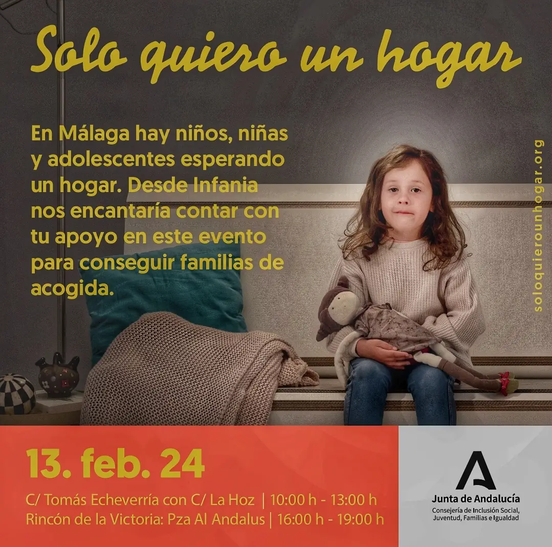 La campaña “Solo quiero un hogar” en la que participa Infania junto a otras SAAF de Andalucía llega a Rincón de la Victoria el próximo jueves 13 de febrero. Respaldada por el Área de Bienestar Social del Ayuntamiento de Rincón de la Victoria, esta campaña informará sobre el acogimiento familiar en la Plaza Al-Ándalus de 16.00 a 19.00 horas.