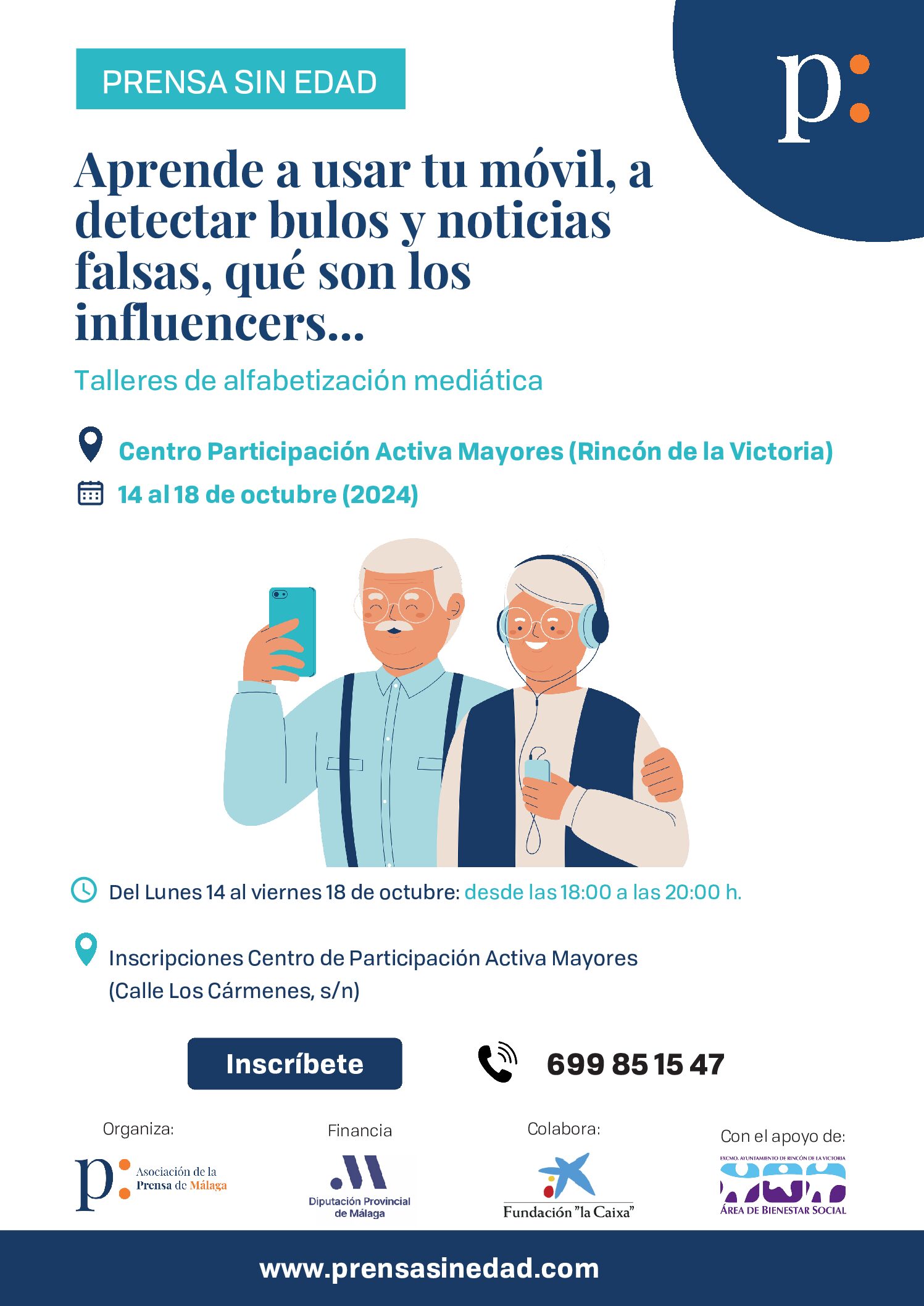 Rincón de la Victoria, 10 de octubre de 2024: Rincón de la Victoria acogerá la celebración de los talleres de alfabetización mediática para mayores enmarcados en el programa Prensa Sin Edad, un innovador proyecto organizado por la Asociación de la Prensa de Málaga (APM) que cuenta con el respaldo de Fundación “la Caixa” y la Diputación Provincial de Málaga, así como con el apoyo del consistorio rinconero.