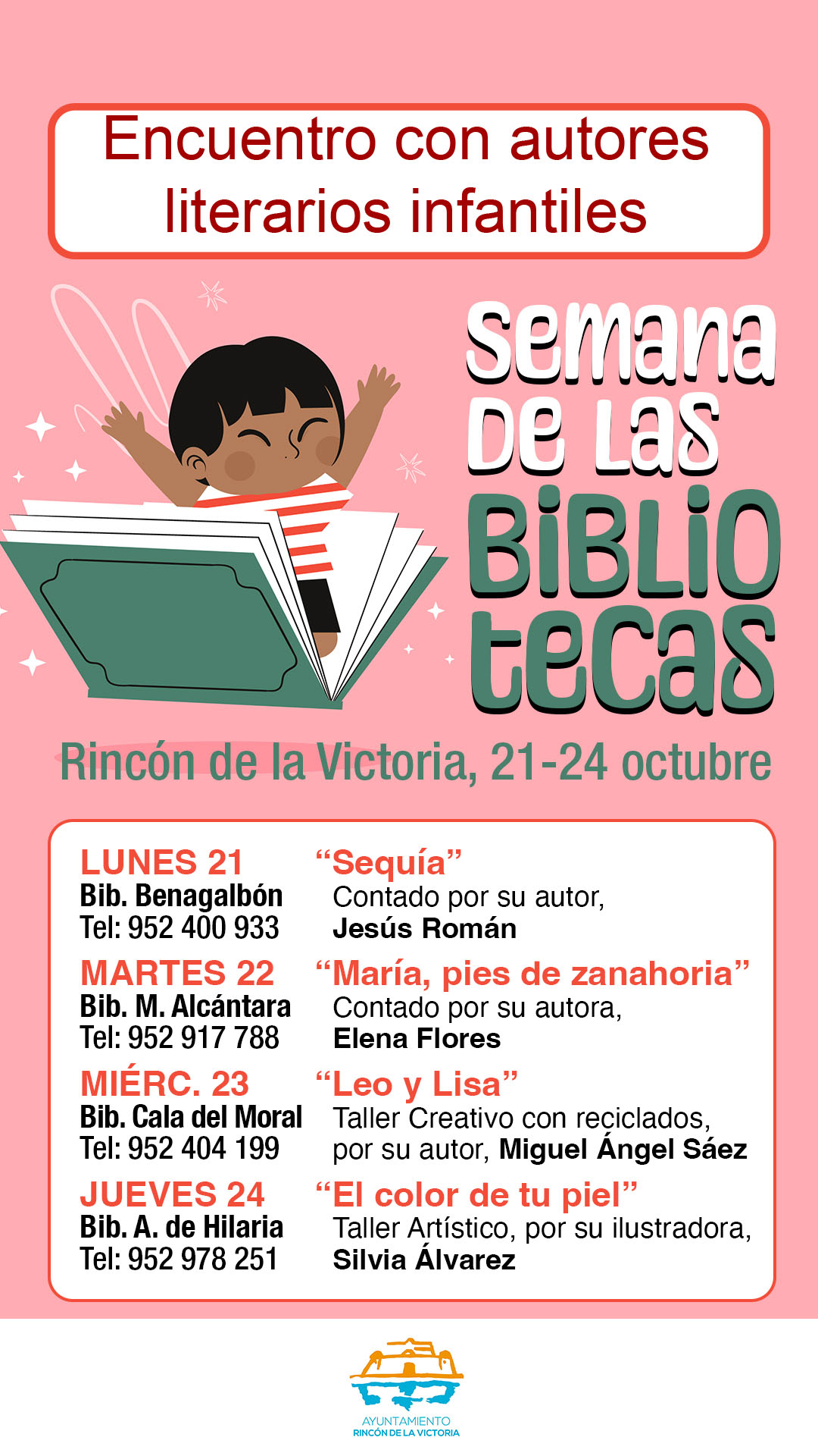 El alcalde de Rincón de la Victoria, Francisco Salado , ha animado a las familias “a acercarse hasta las bibliotecas del municipio, para que los pequeños participen en todas estas actividades de lecturas infantiles en presencia de sus creadores”.