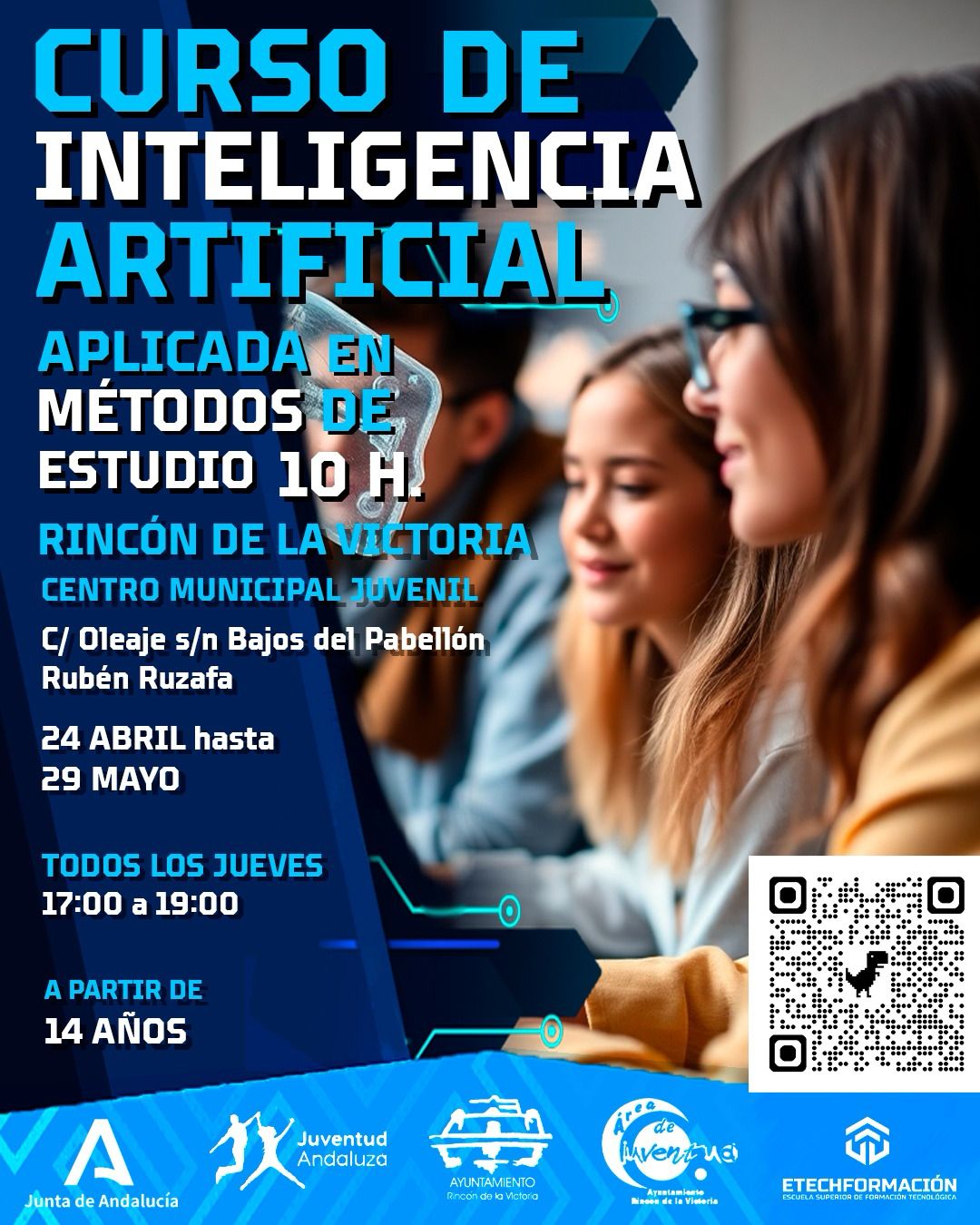 Al igual que el anterior curso, éste también está financiado por el IAJ y cuenta con plazas limitadas. Las inscripciones podrán realizarse desde hoy mismo en el siguiente enlace: https://etechformacion.com/ia-estudiantes-rincon-de-la-victoria/